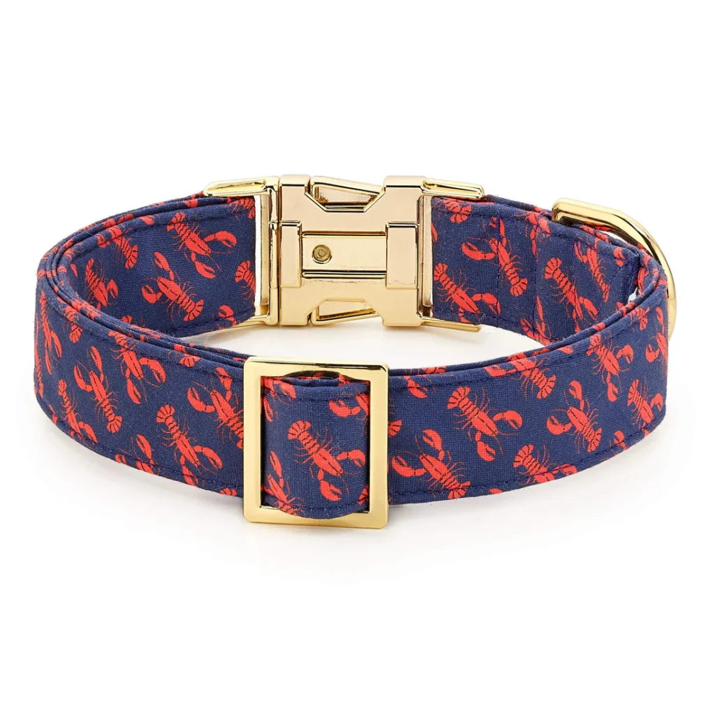 Your pup will look snappy in this navy blue collar, where the hand-drawn lobsters are the Maine attraction. Designed exclusively for The Foggy Dog by artist Cassidy Demkov.
