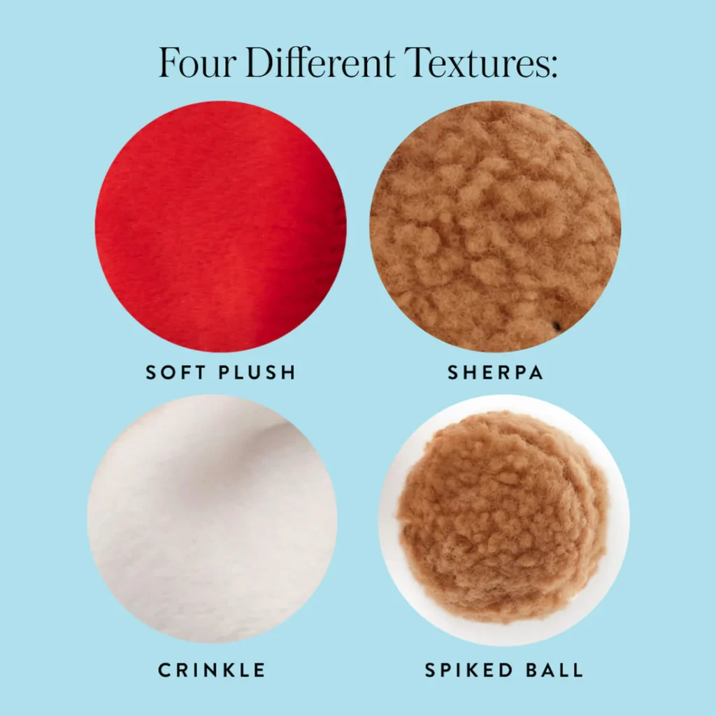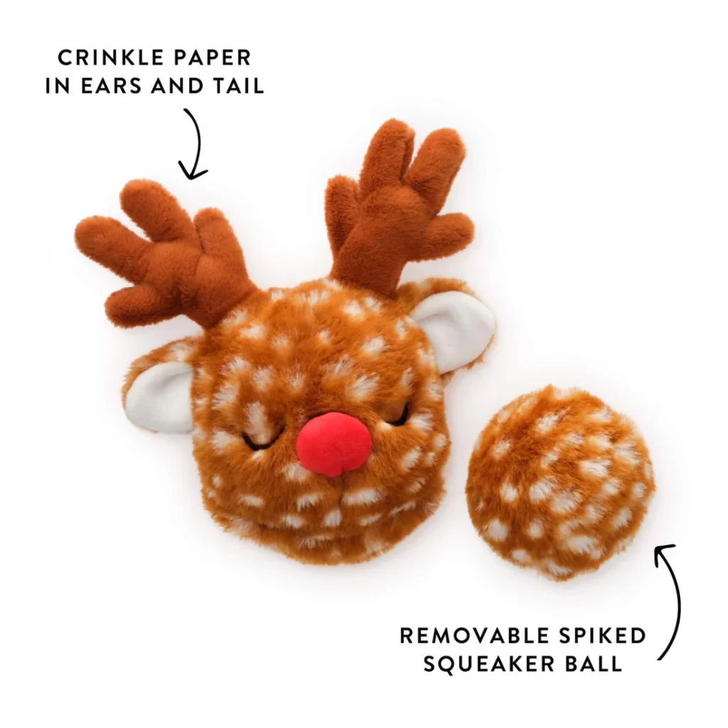 • Reindeer, Penguin, and Santa Teddy Bear each features a removable bouncy squeaker ball, crinkle elements to engage all five senses, and a durable inner mesh lining to help prevent ripping